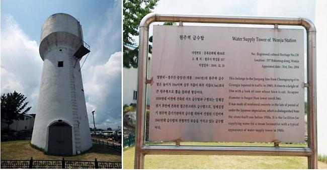 대한민국 근대문화유산이라는 작은 푯말이 있다. 급수탑은 1940년 청량리에서 원주까지 중앙선이 개통되면서 지어진 증기기관차 급수시설이다.